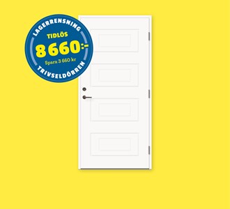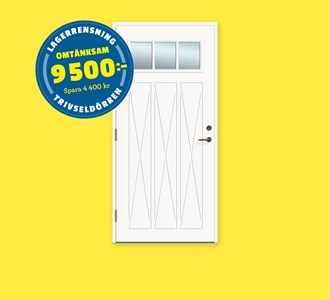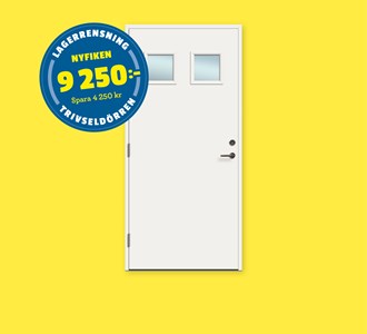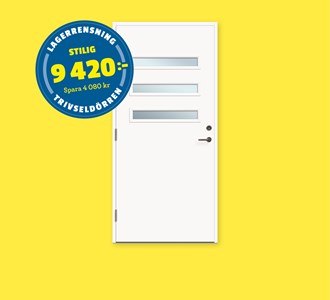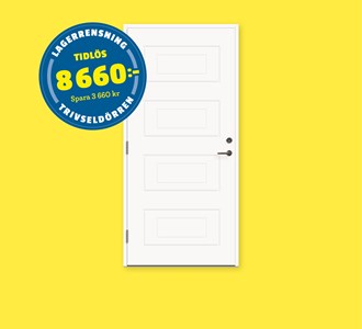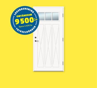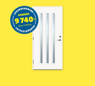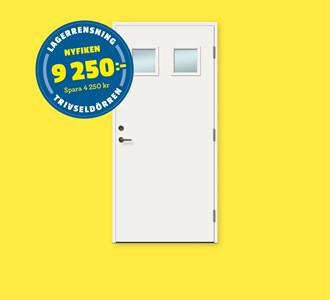 Ge entrén ett lyft med en ny dörr från Trivseldörren. Under vår lagerrensning kan du fynda design och kvalitet till nedsatta priser. Dörrarna finns storlek 10x21 dm, höger- och vänsterhängning och i vitt (NCS S 0502-Y). Finns i ett begränsat antal. Det går bra att lägga till montage, våra montörer finns i hela Sverige.