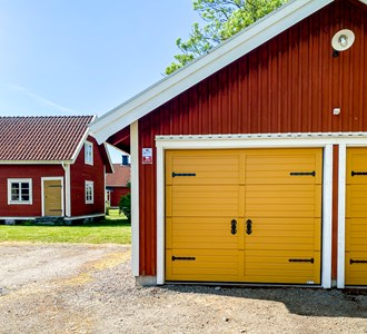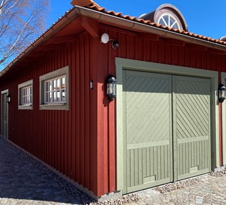 En svensktillverkad slagport från hälsingeskogarna med liggande panel och ett matchade längre fönsterpartier med spröjs som ger Rimforsa sitt signum. Vackra, stora fönsterpartier ger ett bra ljusinsläpp. Sparkplåten i aluzink gör både porten extra tålig och tillför mer lantlig känsla i utförandet.