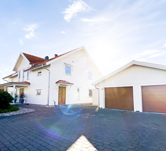 Johanna och hennes familj bor i ett vitt hus med rött tegeltak. ”Vi tycker om den ljusa husfärgen men det har varit jättesvårt att hitta garageport och dörr som passar med rött tegel. När vi flyttade in var port och dörrar också vita men det såg intetsägande och tråkigt ut. En dag åkte jag förbi ett vitt hus med tegeltak och portar i gyllenfärgad ek. Det var så snyggt och vi är fantastiskt nöjda med de nya portarna och dörren. Det känns mycket roligare att komma hem helt enkelt!