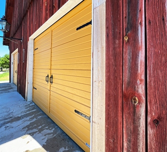 De gula ocra-portarna i modellen UTÖ passar som handen i handsken till Per Mobergs gård som går i falurött, vitt och just smakfulla detaljer i ocra.