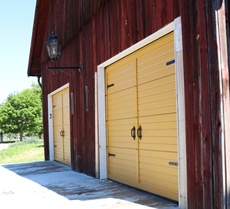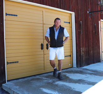 Att välja en portfärg som passar hela gården var inte det lättaste. Men med rätt rådgivning från vår expert i Nyköping landade beslutet på portar i färgen ocra, i takskjutportsmodellen UTÖ.