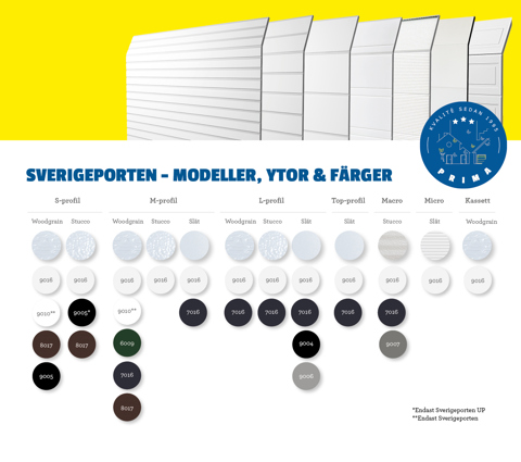 Sverigeporten finns i sju olika profiler, tre ytor, valfri standardfärg och alla storlekar med dragfjäder, upp till som mest 3500x2500 mm. Porten är framtagen för att passa vårt nordiska klimat som bjuder allt från långa heta sommardagar till vinterkyla, för att inte tala om regn som piskar intensivt i hårda vindar. Den mjuka bottenlisten ger bra tätning även vid viss ojämnhet i golvet och de följsamma dubbla sidotätningarna sluter tätt i alla väder. Porten är välisolerad med en 40 mm isolerande kärna av freonfritt polyuretanskum täckt av tjock, förzinkad stålplåt på både in- och utsida vilket ger en stark, stabil och tålig port. Ett mycket bra val för varmgarage och garage i huset.